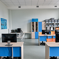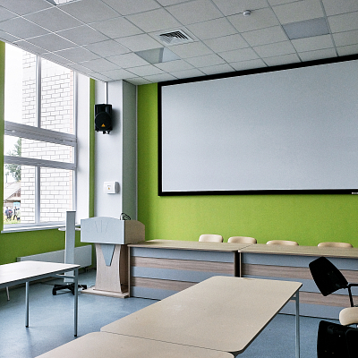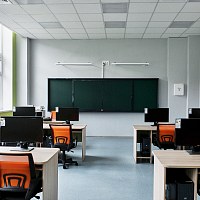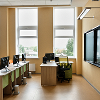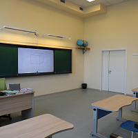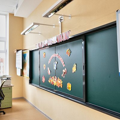 В учебных кабинетах установлены классные доски с рельсовой системой и интерактивной 75-дюймовой панелью. Это позволяет учителю совмещает традиционные и инновационные методики преподавания на классной доске.